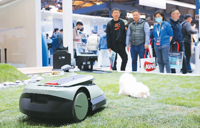 3月14日,在上海新国际博览中心,一款割草机器人在2024年中国家电及消费电子博览会的展馆内进行模拟作业演示。