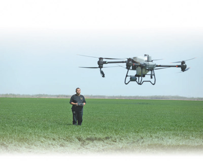李威良在田间操作无人机。