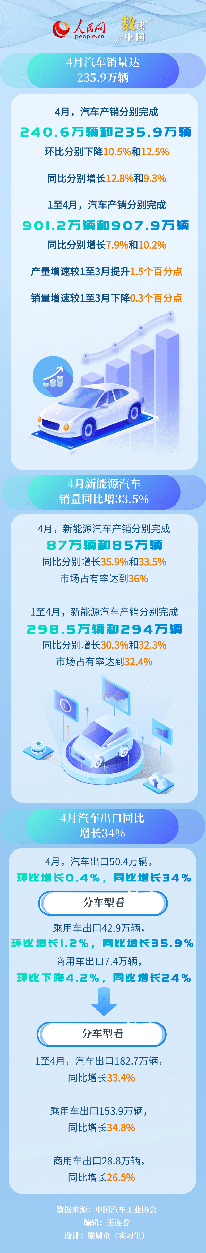 “我国汽车产销环比下降,同比呈现较快增长,其中新能源汽车和汽车出口同比继续保持快速增长。”中国汽车工业协会行业信息部主任刘征在今日召开的汽车产销数据及经济运行情况发布会上介绍,4月,我国经济景气水平总体延续扩张,三大指数继续保持在扩张区间,制造业企业生产继续加快、市场需求继续恢复、企业对近期市场发展信心总体稳定。