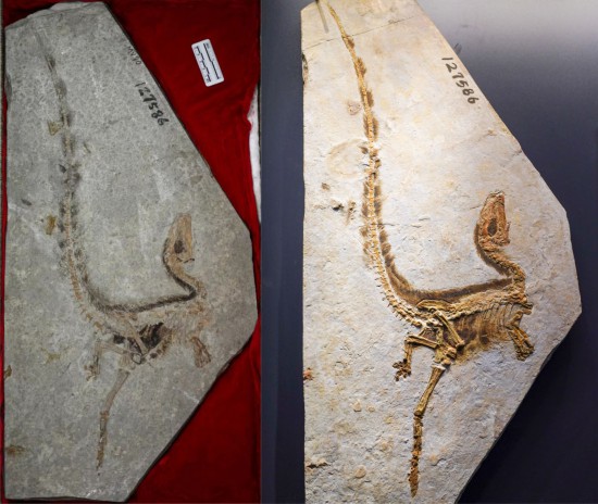 中国科学院南京地质古生物研究所标本馆收藏的原始中华龙鸟模式标本化石(左)和南京古生物博物馆展出的原始中华龙鸟模式标本模型(右)。(左图:中国科学院南京地质古生物研究所供图右图:新华社记者李博摄)